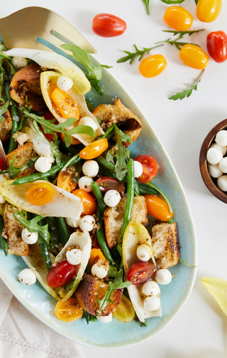 Gently toss in the basil, arugula, and endive leaves and toss. Pour the vinaigrette over the salad, and gently toss with wooden spoons.