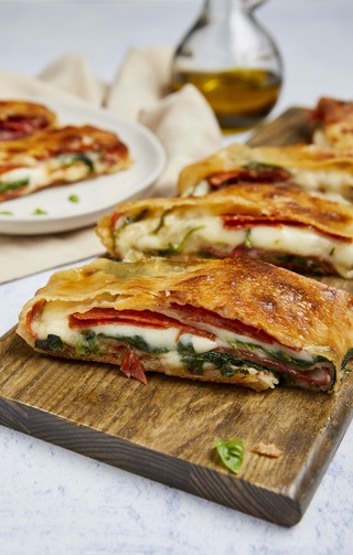 5. On the stretched pizza dough, leaving 1½ inches of space along the outside of the dough, add alternating rows of pepperoni and Mozzarella cheese. Top with spinach. Add Calabrian chili peppers to taste.