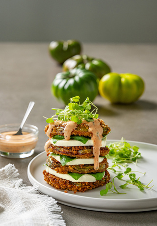To layer, start with a fried green tomato slice and top with 1 slice Mozzarella, followed by a few basil leaves. Repeat layering, ending with a fried green tomato slice.