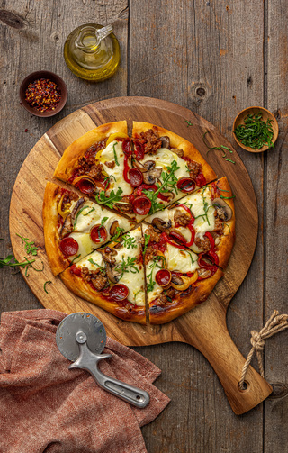 - Scatter caramelized onion, peppers, sausage, pepperoni, and mushrooms on top.