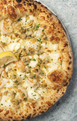 Spread the clams and shrimp around the pie and sprinkle oregano on top.